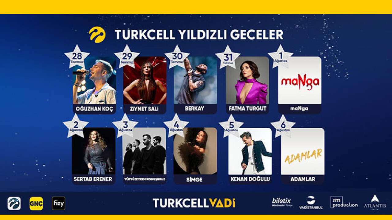 Müzikseverlerin her yıl ilgiyle takip ettiği Turkcell Yıldızlı Geceler konserleri bu yaz 28 Temmuz’da Oğuzhan Koç ile başlıyor. 29 Temmuz’da Ziynet Sali ile devam eden ve Türkiye’nin yıldız sanatçılarını sanatseverlerle buluşturan Turkcell Yıldızlı Geceler konserleri; Vadi İstanbul, SM Production ve Atlantis Yapım iş birliğiyle Turkcell Vadi Açık Hava Sahnesi’nde gerçekleştiriliyor. 6 Ağustos’a kadar yıldız yağmurunun yaşanacağı açık hava sahnesinde, müzik tutkunları Berkay, Fatma Turgut, MaNga, Sertab Erener, Yüzyüzeyken Konuşuruz, Simge Sağın, Kenan Doğulu ve Adamlar ile unutulmaz akşamlar yaşayacak. Ayrıca müzikseverler Oğuzhan Koç, Ziynet Sali, Fatma Turgut ve Simge Sağın konserlerinden önce de fizy dj etkinliklerinde keyifli vakit geçirecekler.