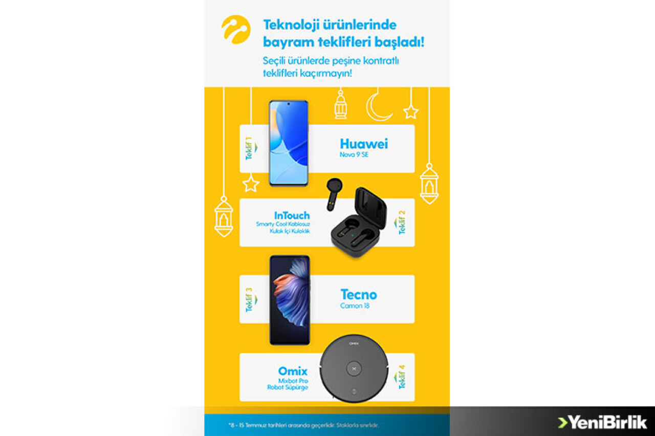 Turkcell'den yapılan açıklamaya göre, 24 Temmuz'a kadar Turkcell mağazalarını ziyaret edenlere akıllı telefondan küçük ev aletlerine kadar onlarca ürün, peşin ödemeye kontrat ve 12 aya varan taksit fırsatlarıyla sunuluyor.