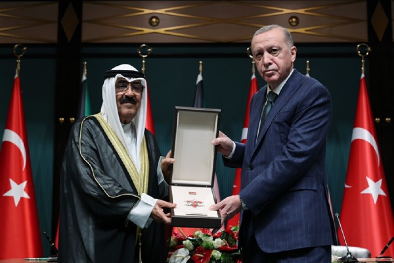 Türkiye Cumhuriyeti Cumhurbaşkanlığı'ndan yapılan açıklamaya göre, Cumhurbaşkanlığı Külliyesi'ndeki törende, iki ülkenin milli marşlarının okunmasının ardından Cumhurbaşkanı Erdoğan, el Sabah'a Türkiye Cumhuriyeti Devlet Nişanı tevcih etti.
