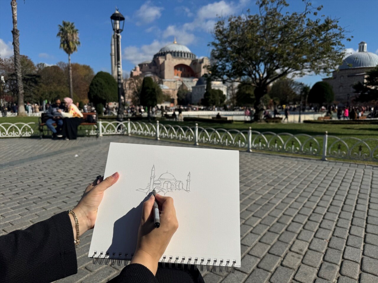 "Ayasofya gibi karmaşık bir yapıyı çizerken yapıyı önce bir seyredip anlamam, oranlarını kafama oturtmam gerekiyor. Daha sonra taslak aşamasında kalemimi bir cetvel gibi kullanıyorum. Yerim sabit olmak üzere yapı üzerinde tutuyorum ve kalemimi oranladıktan sonra deftere aktarıyorum. Temel unsurları oranlı ve perspektifli bir şekilde kağıdıma aktardıktan sonra siyah kalemle bunun detaylarını veriyorum. Pencere detayları, o payandaları olsun. Daha sonra da renklendirme aşamasına geçiyorum. Bu aşamada da malzeme detayı, dokuları vermek önemli oluyor. Genellikle sulu boya ve marker kullanmayı tercih ediyorum. Yani yapıyı çizerken taş dokusunu, o kirliliği, yapı üzerindeki çatlağı bile vermeye özen gösteriyorum."