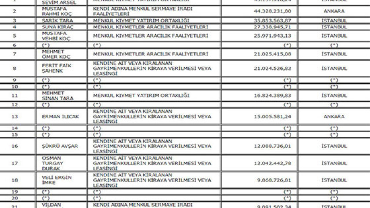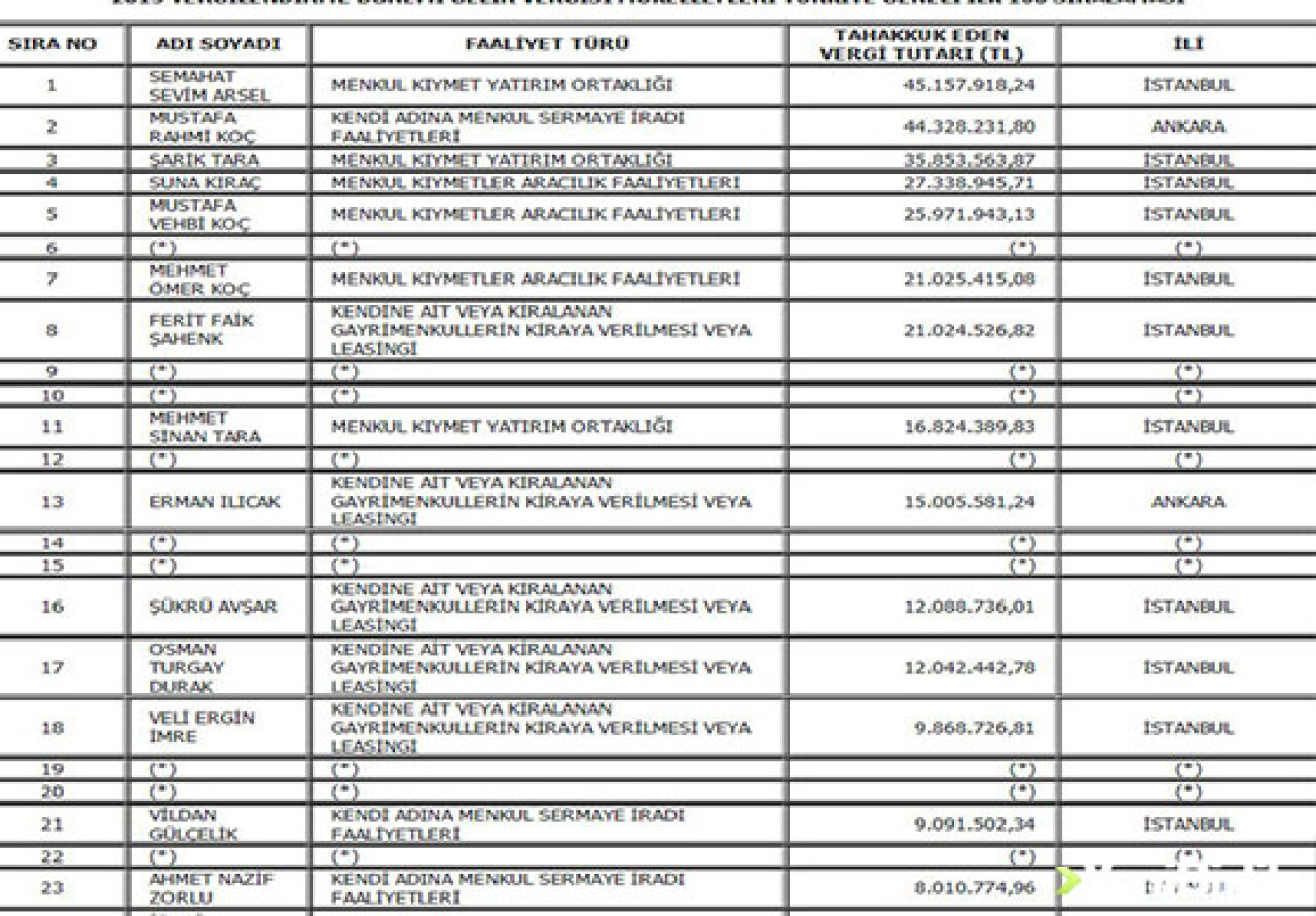 YENİBİRLİK - Maliye Bakanlığı Gelir İdaresi Başkanlığı (GİB), 2015 yılı vergilendirme dönemine ilişkin verilen Gelir Vergisi beyanları sonucunda, Türkiye genelinde en çok vergi beyan eden ilk 100 mükellefi açıkladı. Buna göre 2015 için 45 milyon 157 bin 918,24 lira vergi tahakkuk ettirilen Arsel Türkiye'nin vergi rekortmeni oldu. Arsel'i, 44 milyon 328 bin 231,80 lira vergi tahakkuk ettirilen Mustafa Rahmi Koç izledi. Arsel ve Koç'u, 35 milyon 853 bin 563,87 lira vergi tahakkuk ettirilen Şarık Tara takip etti. 2014 yılının vergi rekortmeni Tara, geçen yıl üçüncü sırada yer aldı.