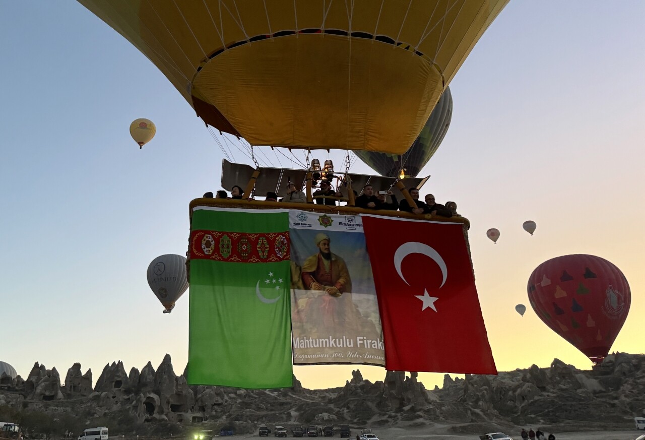 Türkmenistan'ın Ankara Büyükelçiliği, EkoAvrasya Vakfı ve Türk Dünyası Sivil Toplum İşbirliği Derneğince "2024 Mahtumkulu Firaki Anma Yılı" kapsamında düzenlenen etkinlikte, Nevşehir'in Göreme beldesinde gün doğumunda uçuş için hazırlanan sıcak hava balonunun sepetine, Türk ve Türkmenistan bayrakları ile Firaki'nin posteri asıldı.