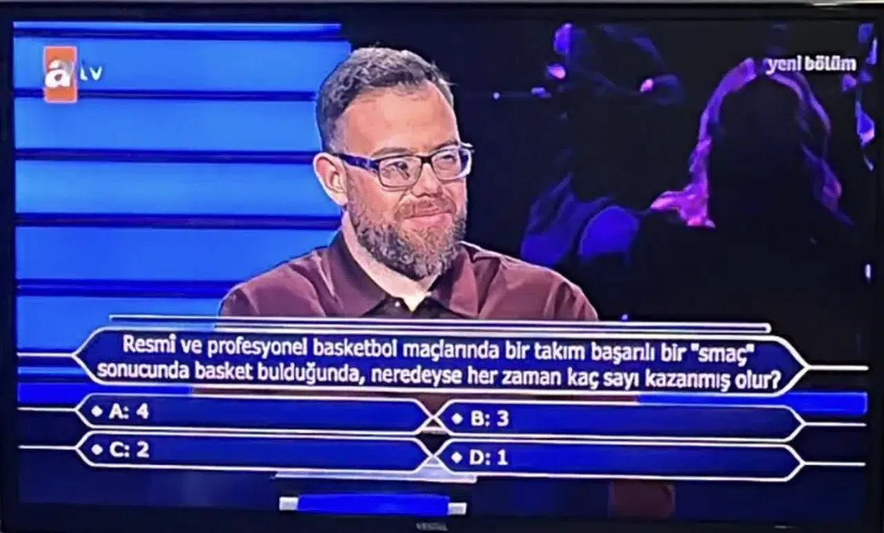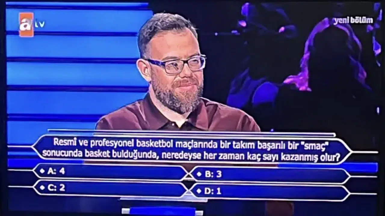 Kim Milyoner Olmak İster’in ATV’de yayınlanan yeni bölümünde Oktay Kaynarca’nın yarışmacıya yönelttiği spor sorusu dikkat çekti. Resmi ve profesyonel basketbol maçlarında yapılan başarılı bir smaç sonrası kaç sayı kazanıldığına odaklanan soru; 1, 2, 3 ve 4 gibi seçenekleriyle hem yarışmacıyı hem de ekran başındaki basketbolseverleri tereddütte bıraktı.