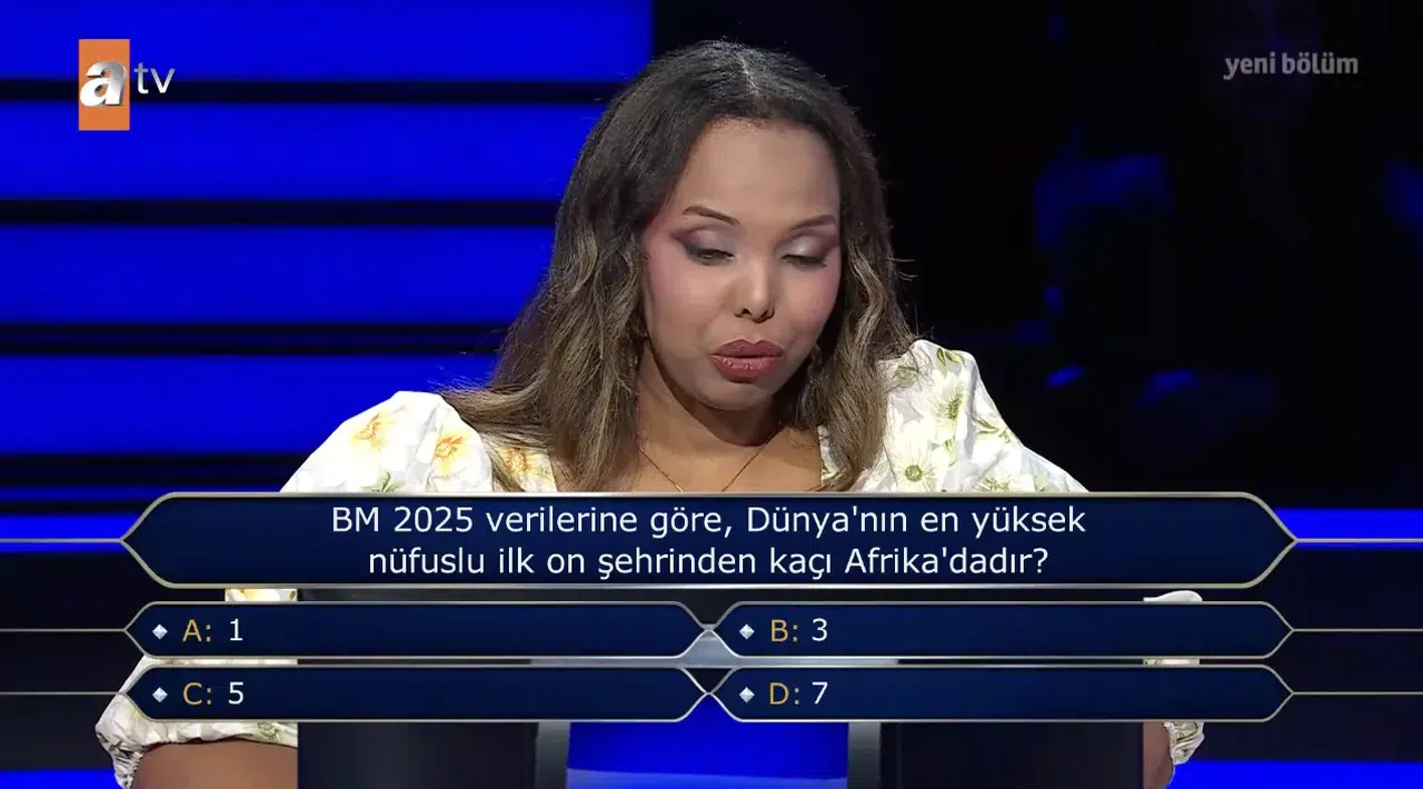 Kim Milyoner Olmak İster’de Oktay Kaynarca’nın yönelttiği bu dikkat çekici soru, BM 2025 verilerine dayanıyor. Dünyanın en kalabalık ilk 10 şehri arasında Afrika kıtasının yeri izleyenleri şaşırtıyor. Coğrafya ve güncel istatistik bilgisini bir araya getiren soru, sosyal medyada da merak konusu oldu ve cevabı öğrenmek isteyenler araştırmaya başladı.
