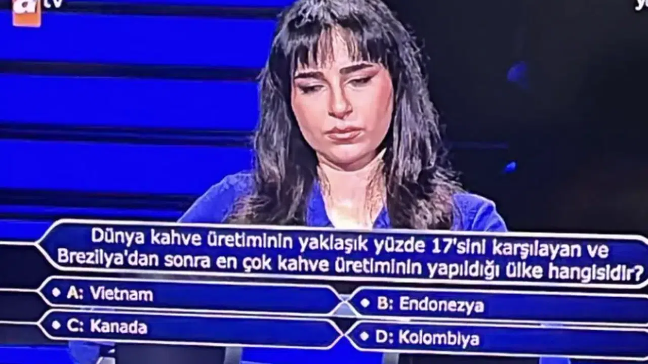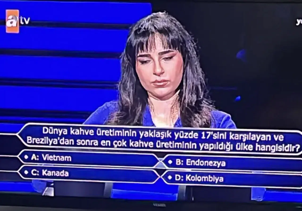 Kim Milyoner Olmak İster’in ATV ekranlarında yayınlanan yeni bölümünde Oktay Kaynarca’nın yarışmacıya yönelttiği soru yine dikkat çekti. Dünya kahve üretiminde önemli paya sahip ülkeleri konu alan soru; Brezilya’dan sonra en fazla üretimin yapıldığı ülkeyi sorgulamasıyla hem yarışmacıyı hem de ekran başındaki izleyicileri tereddütte bıraktı.