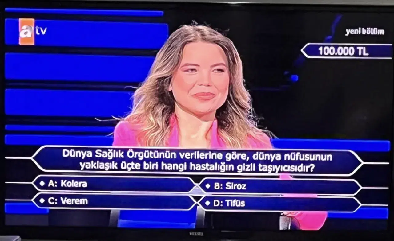 ATV ekranlarında Oktay Kaynarca’nın sunumuyla yayınlanan Kim Milyoner Olmak İster yarışmasında sorulan bu soru, hem stüdyoda hem ekran başında izleyenleri şaşırttı. Dünya Sağlık Örgütü’nün paylaştığı çarpıcı verilere dayanan soru, dünya nüfusunun önemli bir bölümünü ilgilendiren gizli bir sağlık gerçeğine işaret ediyor. Cevabı duyanlar oldukça şaşırıyor.