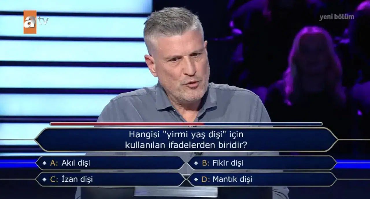 Oktay Kaynarca’nın sunumuyla ATV’de yayınlanan Kim Milyoner Olmak İster’de sorulan bu soru, “yirmi yaş dişi” için kullanılan ifadeler üzerine kurulu. Şıklar arasında kalan yarışmacı izleyenleri de düşündürdü. Basit gibi görünen ancak dil bilgisi açısından dikkat isteyen bu soru, sosyal medyada da merak uyandırdı.