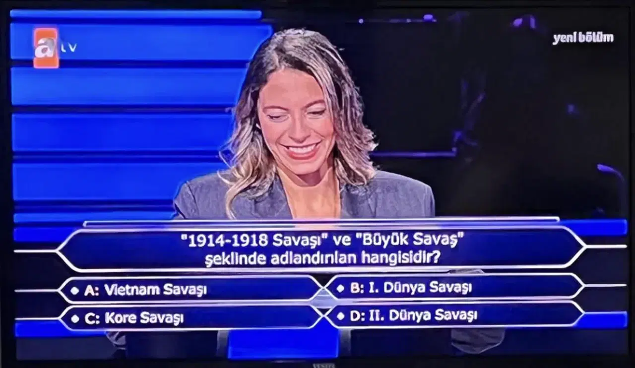 Kim Milyoner Olmak İster’de Oktay Kaynarca’nın yönelttiği bu soru, dünya tarihinin en kritik dönemlerinden birine odaklandı. 1914-1918 yılları arasında yaşanan ve “Büyük Savaş” olarak da adlandırılan savaşla ilgili soru, yarışmacı kadar ekran başındaki izleyicileri de düşündürdü. Şıklar arasında yer alan farklı savaş isimleri kafa karışıklığı yaratırken, pek çok kişi doğru yanıtı hatırlamak için araştırma yapmaya başladı.