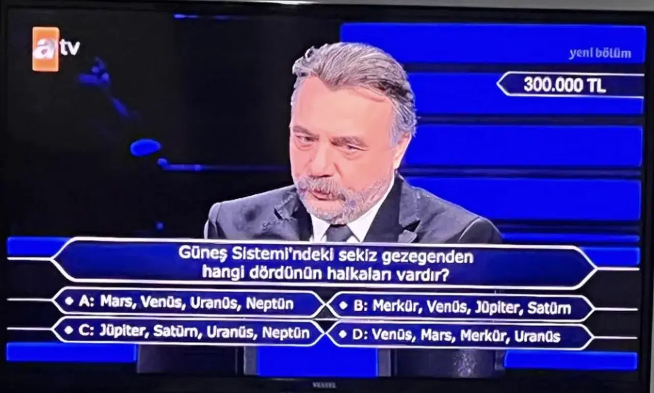 ATV ekranlarında Oktay Kaynarca’nın sunduğu Kim Milyoner Olmak İster yarışmasında bu kez uzayla ilgili bir soru soruldu. Güneş Sistemi’ndeki gezegenlerin özelliklerini sorgulayan bu soru, özellikle halkalara sahip gezegenler konusuyla izleyicilerin ilgisini çekti. Yarışma sırasında sorulan bu bilgi dolu soru, ekran başındakiler arasında merak uyandırdı.