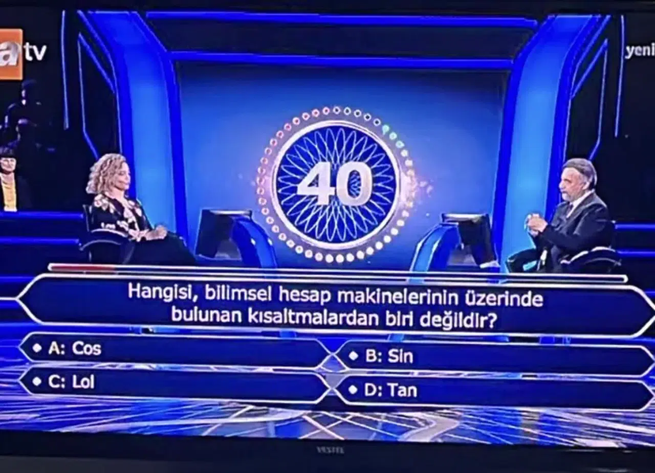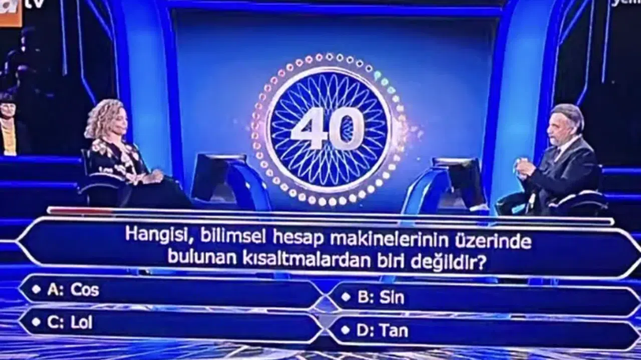 Kim Milyoner Olmak İster’in ATV ekranlarında yayınlanan yeni bölümünde Oktay Kaynarca’nın yönelttiği soru yine geceye damga vurdu. Bilimsel hesap makinelerinde yer alan kısaltmaları sorgulayan soru; matematik bilgisine güvenen izleyicileri bile tereddütte bıraktı. Cos, Sin, Tan gibi tanıdık ifadeler arasında yer alan farklı bir seçenek dikkat çekti.