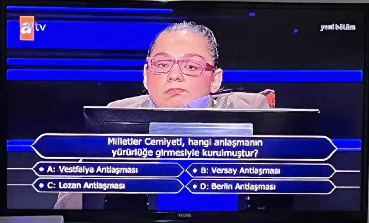 ATV’de Oktay Kaynarca’nın sunduğu Kim Milyoner Olmak İster yarışmasında sorulan Milletler Cemiyeti sorusu izleyenleri ekrana kilitledi. Tarihin seyrini değiştiren anlaşmalardan biriyle ilgili olan bu soru, yarışma sırasında heyecanı artırdı. Hangi anlaşmanın Milletler Cemiyeti’nin kurulmasına yol açtığı sorusu, hem yarışmacıyı hem de ekran başındakileri düşündürdü.