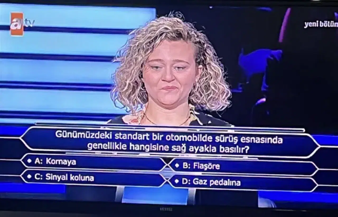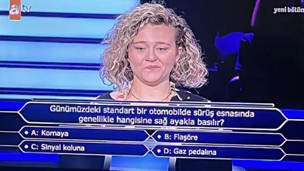 Kim Milyoner Olmak İster’in ATV ekranlarında yayınlanan yeni bölümünde Oktay Kaynarca’nın yönelttiği soru yine gündem oldu. Günlük hayatta milyonlarca sürücünün farkında olmadan yaptığı bir davranışı konu alan soru; korna, flaşör, sinyal kolu ve gaz pedalı seçenekleriyle yarışmacıyı olduğu kadar ekran başındakileri de düşündürdü.