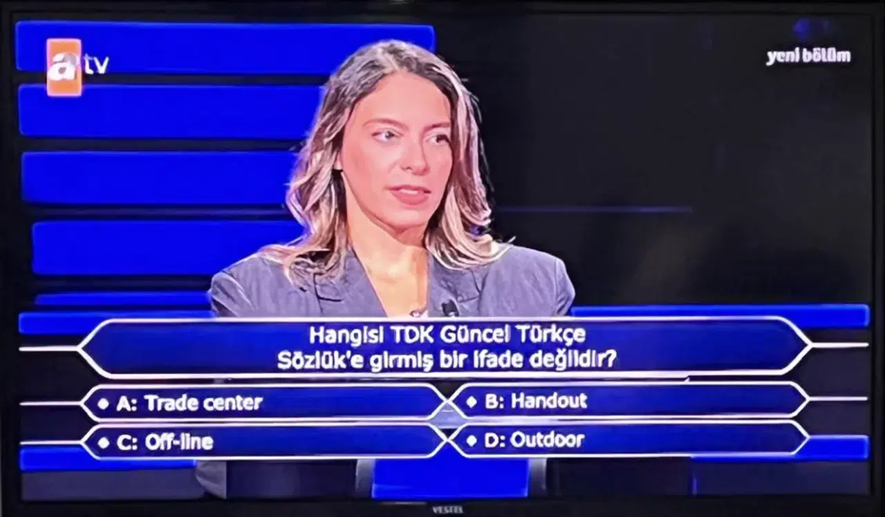 Kim Milyoner Olmak İster’de Oktay Kaynarca’nın yönelttiği bu soru, Türk Dil Kurumu’nun Güncel Türkçe Sözlüğü üzerineydi. Günlük hayatta sıkça kullanılan yabancı kökenli ifadeler arasından hangisinin sözlükte yer almadığının sorulması, yarışmacıyı olduğu kadar ekran başındaki izleyicileri de düşündürdü.