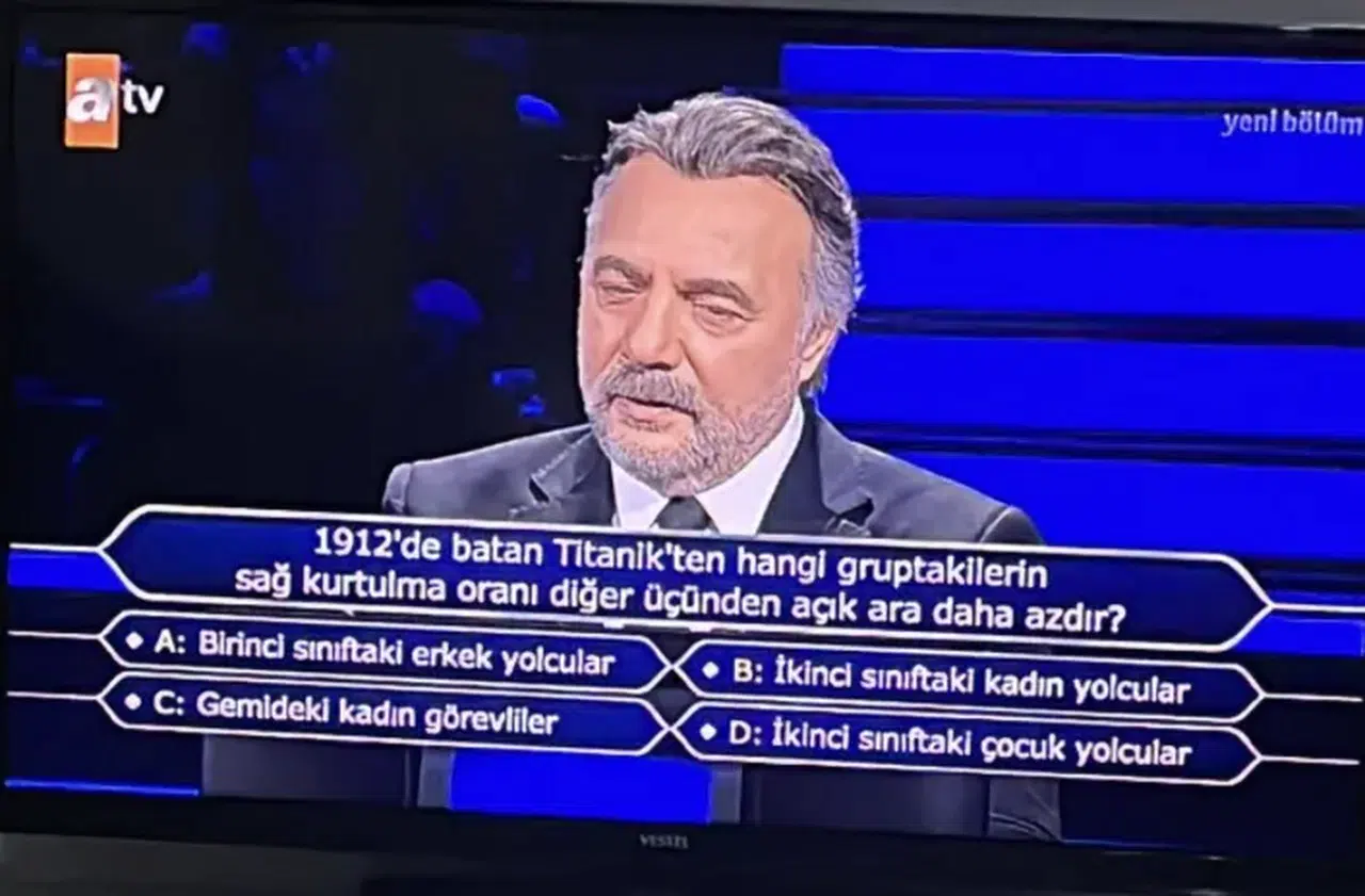 Kim Milyoner Olmak İster’in ATV’de yayınlanan yeni bölümünde Oktay Kaynarca’nın yarışmacıya yönelttiği tarih sorusu geceye damga vurdu. 1912 yılında batan Titanic’te farklı yolcu gruplarının kurtulma oranlarını konu alan soru; sınıf, yaş ve görev farklarının sonuçlara nasıl yansıdığına dair merak uyandırdı ve ekran başındaki izleyicileri düşündürdü.