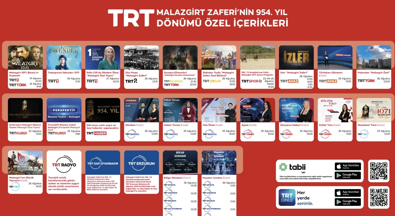 Türklere Anadolu’nun kapısını açan 1071 Malazgirt Zaferi, bu yıl da TRT'nin güçlü yayınlarıyla milyonlarla buluşuyor. Her kanalında farklı içeriklerle zenginleştirilen yayın akışı, sadece bir anma değil; geçmişle bugünü buluşturan bir tarih şöleni sunuyor. TRT’nin televizyon ve radyo kanalları, yılın en özel tarihsel yayınlarını izleyiciyle buluşturmak için büyük bir hazırlık süreci geçirdi.
