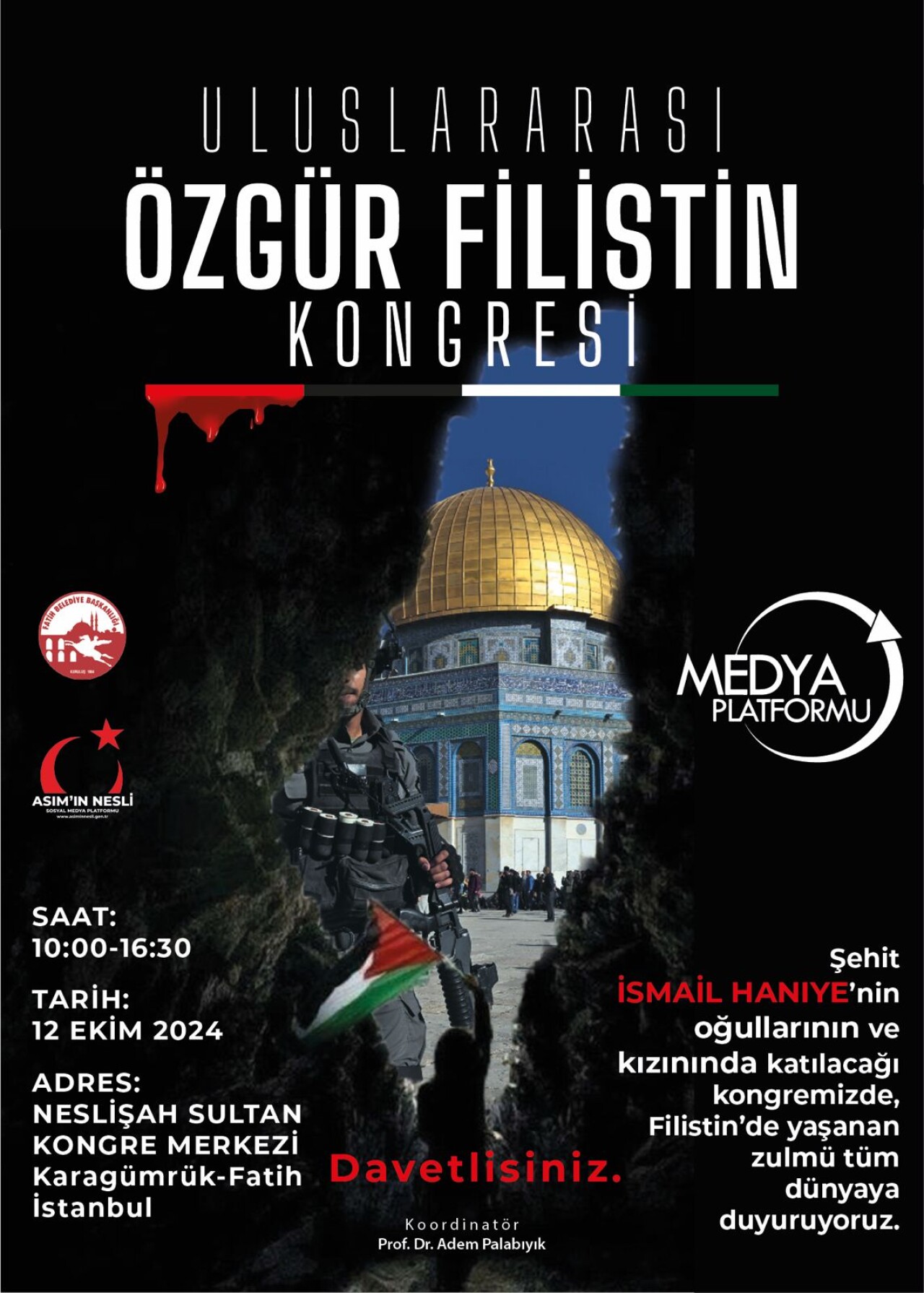 Medya Platformu'nun düzenlediği ve Başkanlığını Mustafa Açıkgöz'ün, Koordinatörlüğünü Prof. Dr. Adem Palabıyık'ın üstlendiği Uluslararası Özgür Filistin Kongresi, 12 Ekim'de İstanbul'da gerçekleştirilecek. Kongreye, İran'da şehit edilen İsmail Heniye'nin çocukları Katar'dan gelerek önemli isimlerle bir araya gelecekler.