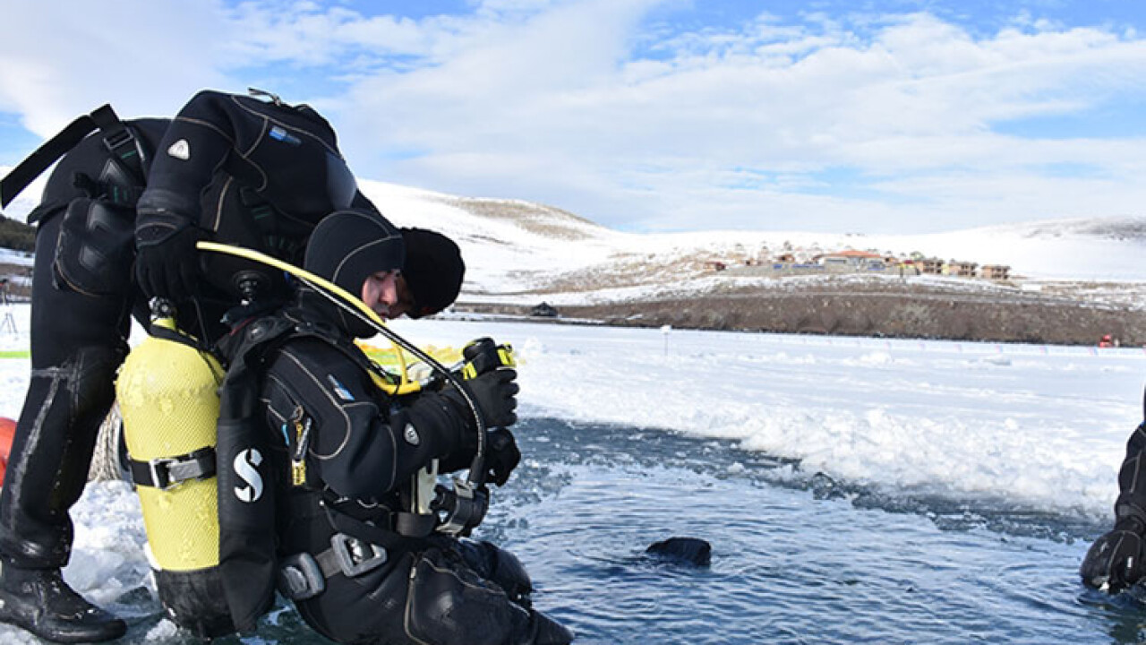 Ardından özel kıyafetlerini giyen timler, hava sıcaklığının sıfırın altında 20 dereceye düştüğü bölgedeki buzla kaplı göle tüplü dalış yaptı.