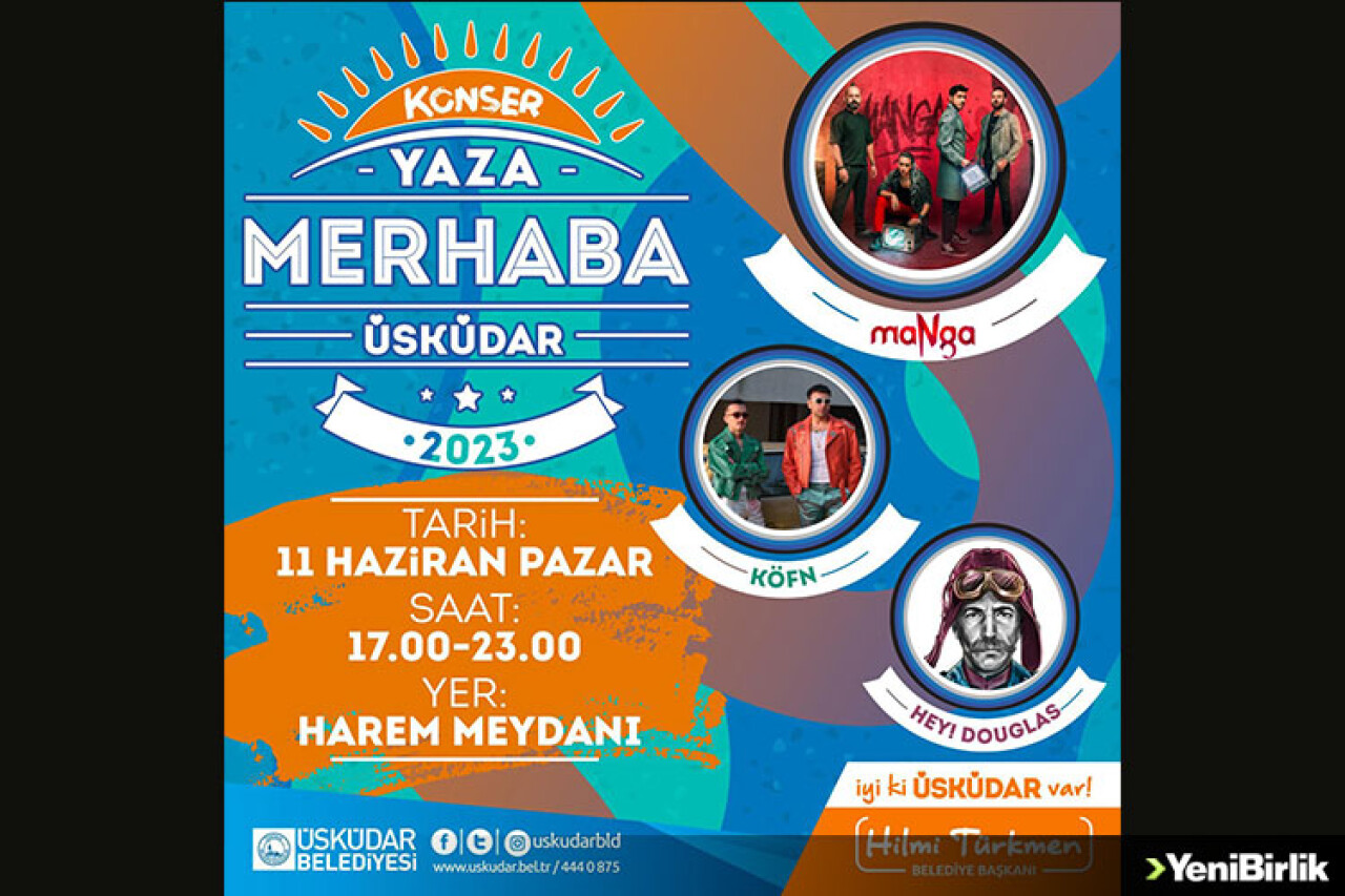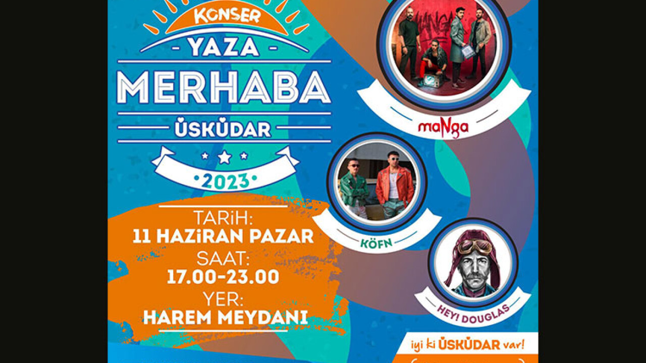 Üsküdar Belediyesi’nin düzenlediği “Yaza Merhaba Konseri” binlerce genci müzik ziyafetiyle buluşturuyor. 11 Haziran Pazar günü, saat 17.00’da, Harem Etkinlik Alanı’nda düzenlenecek olan konser kapsamında gençlerin sevdiği Köfn, maNga ve Hey! Douglas sahne alacak. Yazın coşkusunu Üsküdar’da yaşamak için binlerce kişinin katılması beklenen konser kapsamında sahne alacak isimler en sevilen parçalarını gençlerle birlikte hep bir ağızdan seslendirecek.