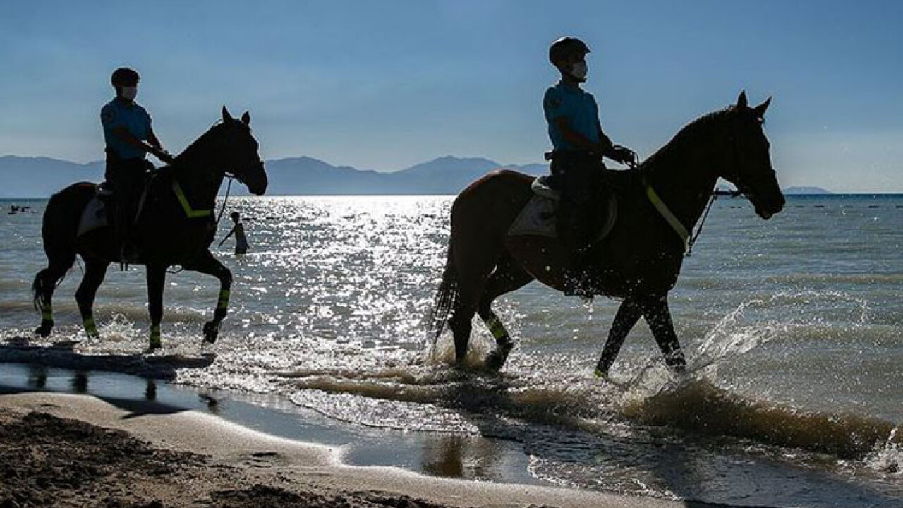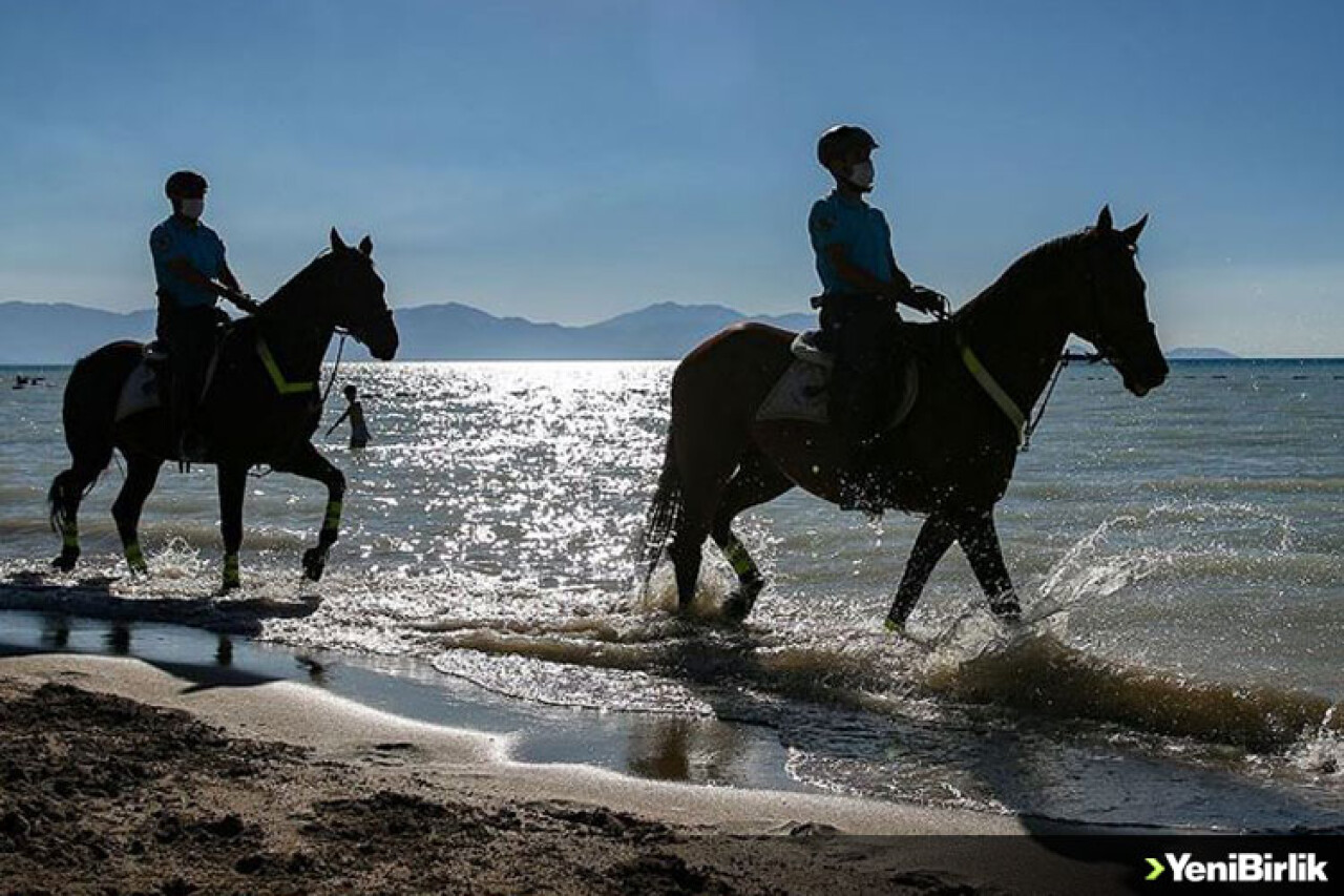 Yeni tip koronavirüs (Kovid-19) tedbirleri kapsamında vatandaşları sosyal mesafe konusunda da uyaran atlı jandarmalar, motorlu araçların giremediği Van Gölü'nün sahil bandı boyunca halkın huzur ve güvenliğinin sağlanması amacıyla devriye geziyor.