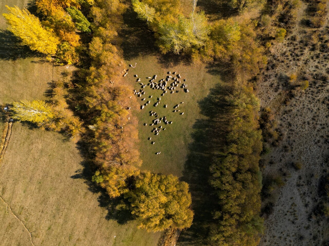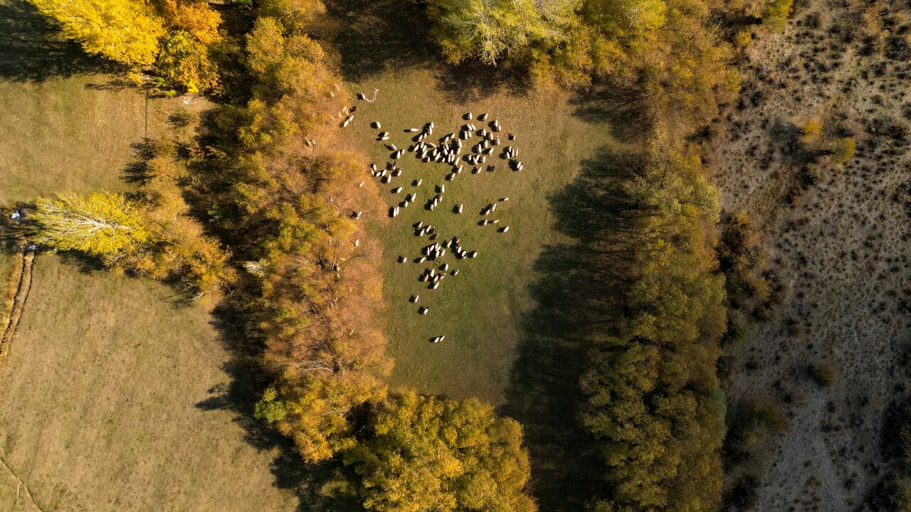 Sonbahar renklerine bürünen ovada otlatılan sürüler, dron ile görüntülendi.