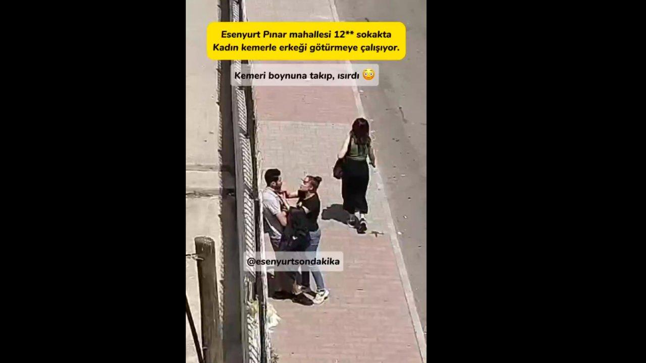 Esenyurt'ta sokak ortasında bir kadın, yanındaki erkek arkadaşının boğazını kemerle sıktı ardından suratına tükürdü ve son olarak alnından öptü... Bu tuhaf anlar kameraya yansıdı.