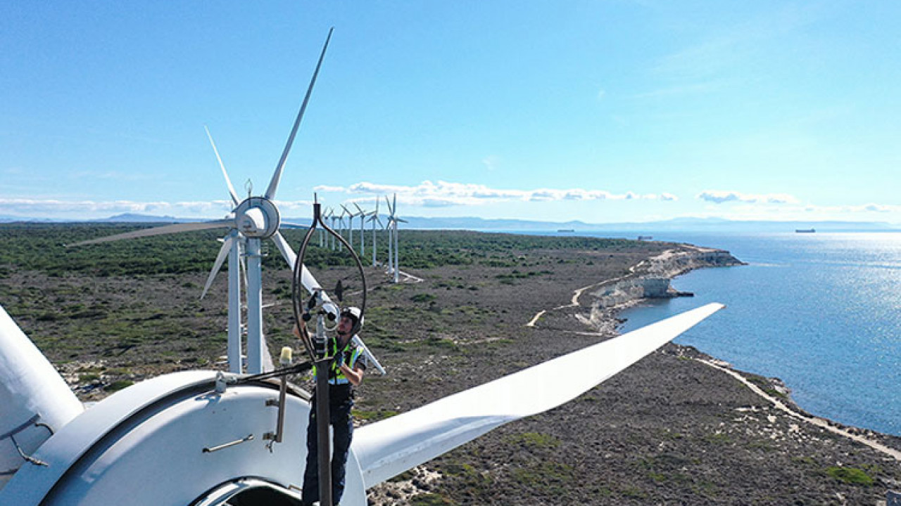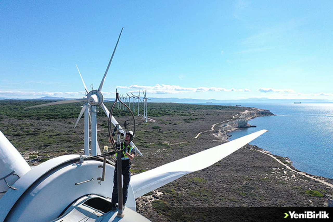 Çanakkale'nin Bozcaada ilçesinde 10,2 megavatlık üretim kapasitesine sahip Bozcaada Rüzgar Enerji Santrali'ndeki 17 rüzgar türbininin bakımı, onlarca metre yükseklikte uzman personel tarafından yapılıyor.
