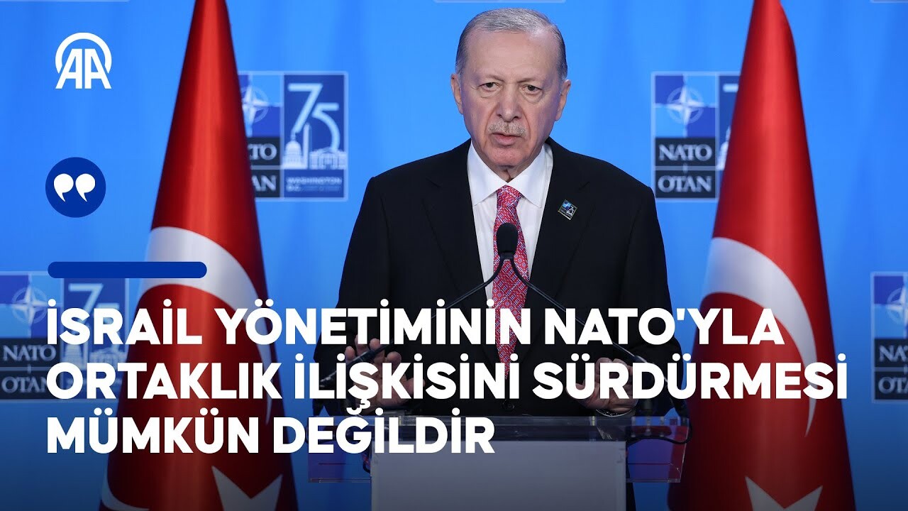 Cumhurbaşkanı Erdoğan, "İttifakımızın temel değerlerini ayaklar altına alan İsrail yönetiminin NATO'yla ortaklık ilişkisini sürdürmesi mümkün değildir." ifadelerini kullandı.