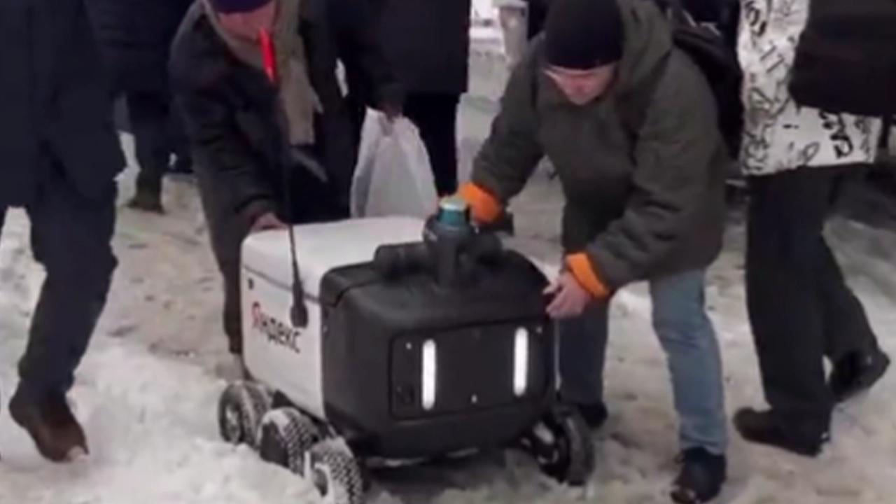 Sosyal medyada paylaşılan bu görüntülerde Yandex Robot Kurye kaldırımı kaplayan karın ağırlığının üstesinden gelemedi. Kar yağışından dolayı yolda mahsur kalan robot çevredekilerin yardımına ihtiyaç duydu. Vatandaşlar tarafından ilerletilmeye çalışan robotun güçlükle hareket ettirildiği görüldü.