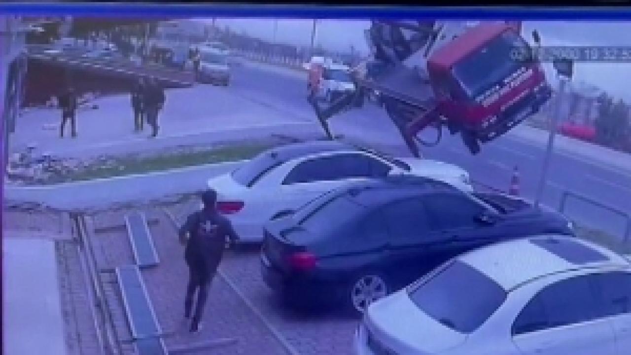 Bakırköy'de, bir binanın dış cephe temizliği için kullanılan vinç devrildi. Vinç sepetinde bulunan 2 işçi yaralanırken o anlar güvenlik kamerası tarafından kaydedildi.