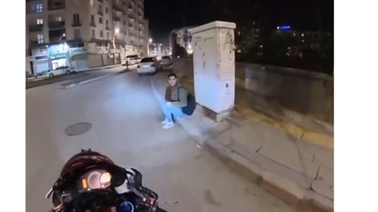Motosikletlinin kask kamerasına yansıyan görüntülerde ikili arasında güldüren konuşmalar yaşandı.