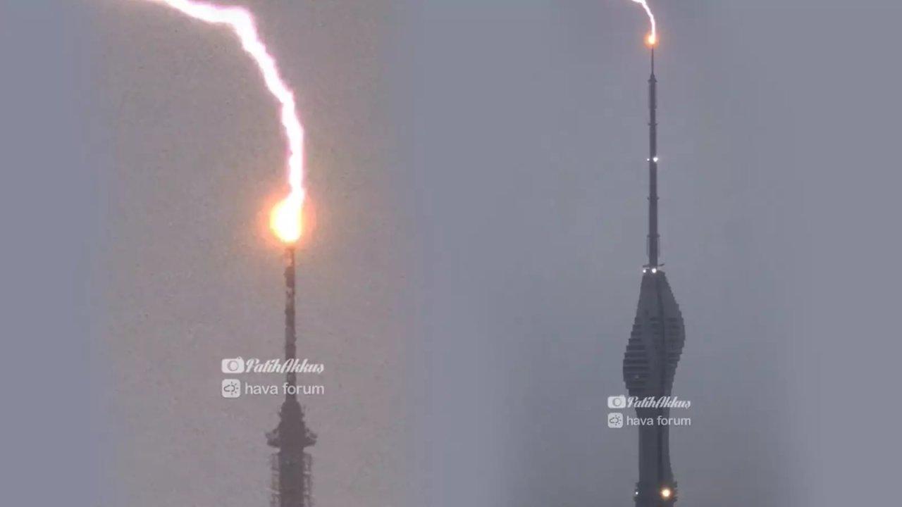 Sosyal medyada yayınlanmasının ardından gündem olan görüntülerde yıldırım düşmesinin hemen ardından kulenin karanlığa gömüldüğü görülüyor.
