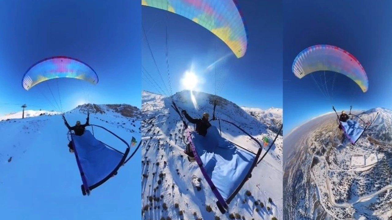 Eşsiz kar ve dağ manzaraları eşliğinde yamaç paraşütü ile uçan ikili çift kişilik ranzada yatarak keyifle uçuşunu tamamladı.