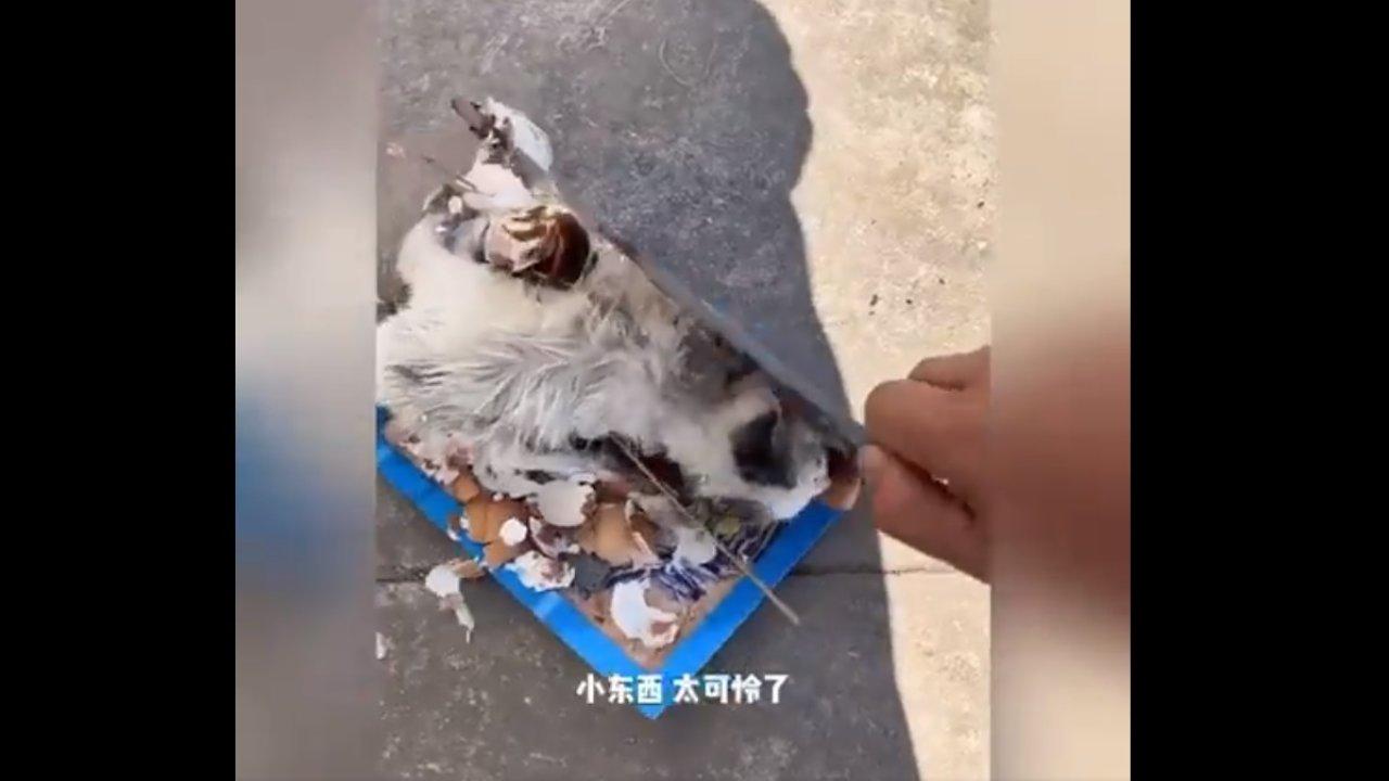 Bir Asya ülkesinde çöpte tutkalla kartona yapışan ve çaresizce hareketsiz kalan yavru kedi, adamın uğraşı sayesinde kurtuldu. Yavru kedinin çöpteki o hali görenlerin yüreğini sızlattı.
