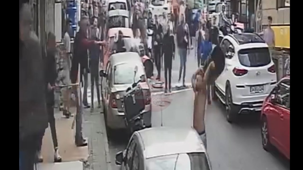 Elindeki varili fırlatan adam, aynı anda sopalarla da saldırmaya devam etti. O anlar sokakta bulunan bir iş yerinin güvenlik kameralarına yakalandı.