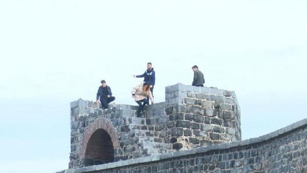 Diyarbakır'da UNESCO Dünya Kültür Mirası Listesi'nde bulunan 10-12 metre yüksekliğindeki surlara, onlarca kişinin yasağa rağmen çıkıp, özçekim yapması kameraya yansıdı.