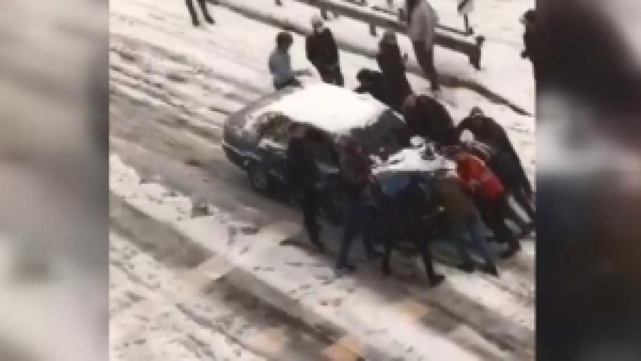Esenyurt'ta buzlanma nedeni ile kaymaya başlayan otomobili 11 kişinin durdurmaya çalıştı. O anlar cep telefonu kamerasına yansıdı.