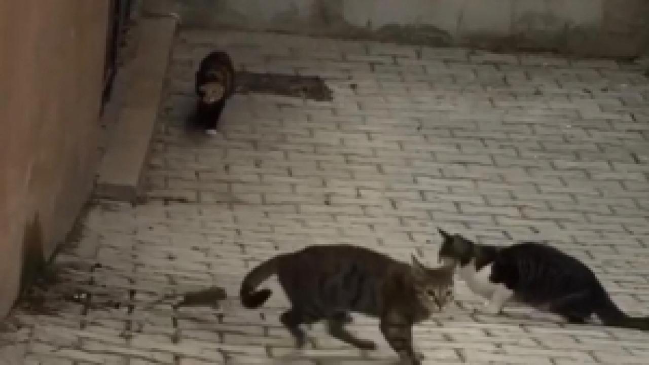 Hatay'da, sokak ortasındaki bir fare kendisini çevreleyen 5 kediyi kovaladı. O anlar, bir kişi tarafından cep telefonu kamerasıyla görüntülendi.