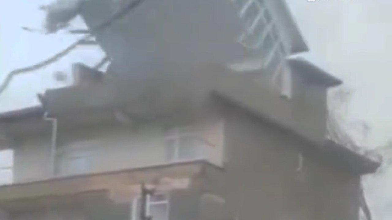 Kentte fırtınalı havanın etkili olduğu anlarda bir apartmanın çatı katının uçtuğu dakikalar cep telefonu kamerası ile kaydedildi.