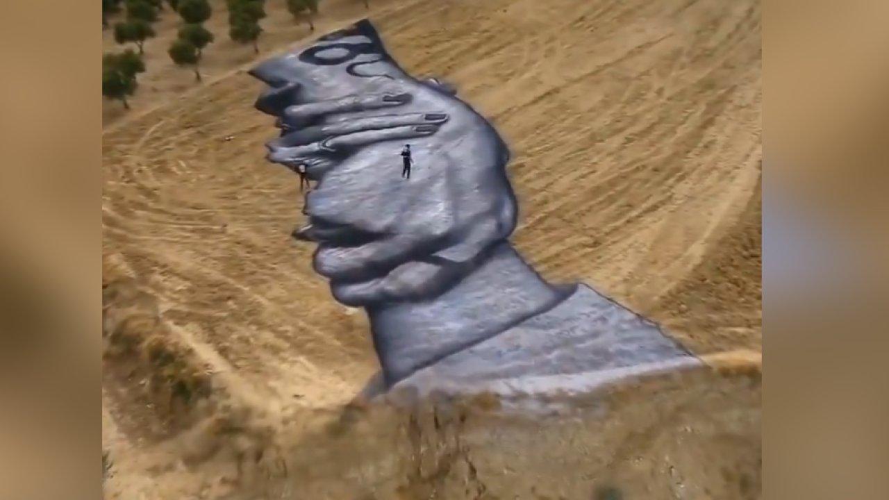 Geniş bir arazi üzerinde çizimini gerçekleştiren sanatçı, eserinde Hatay Depremi'nden sonra sergilenen dayanışmayı simgelediğini belirtti.