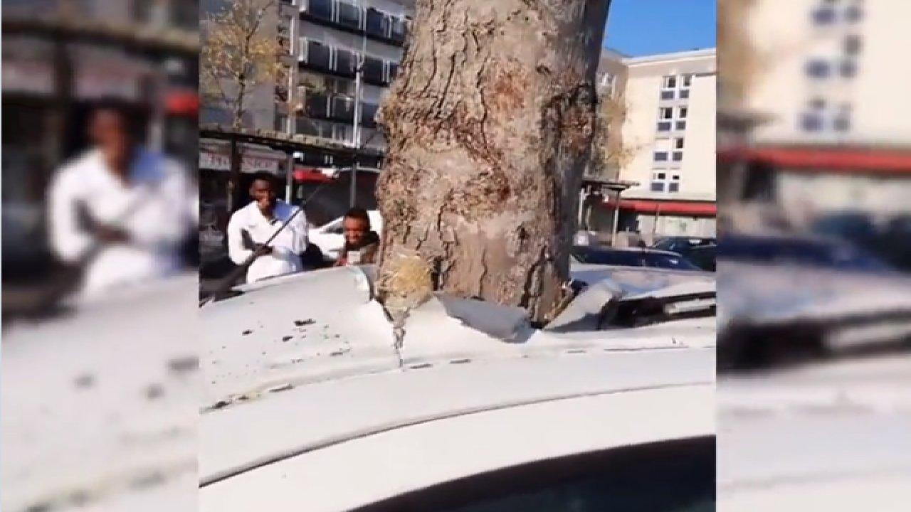 Yoldan geçenlerin şaşkın bakışlarına konu olan olayda bir ağacın, arabanın tam ortasına girdiği anların görüntüsü yer alıyor.