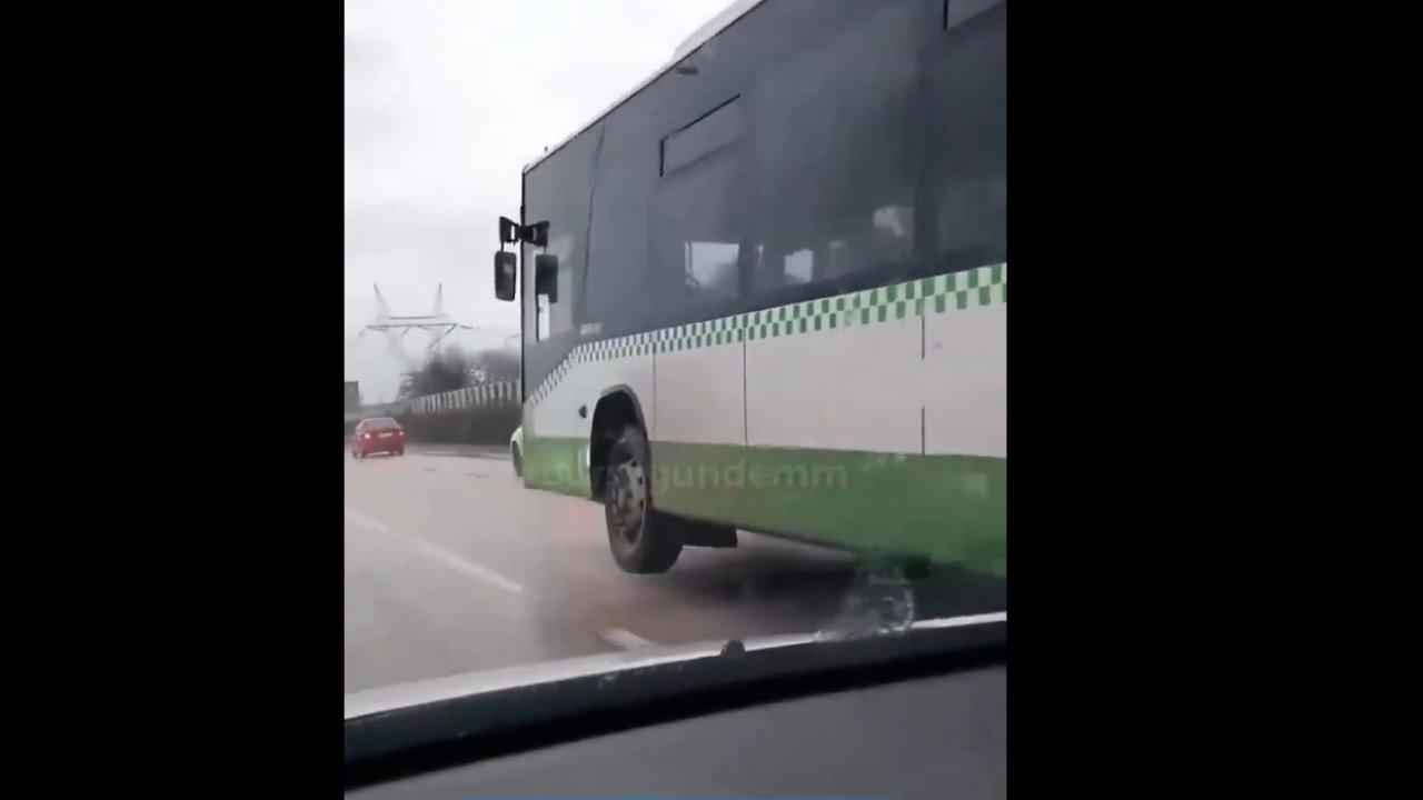Yağışlı havada tekerlekleri havada seyir halinde olan otobüs sürücüsü yanından geçen araçlarda bulunan vatandaşların şaşkın bakışlarına aldırmadan yolculuğuna devam etti.