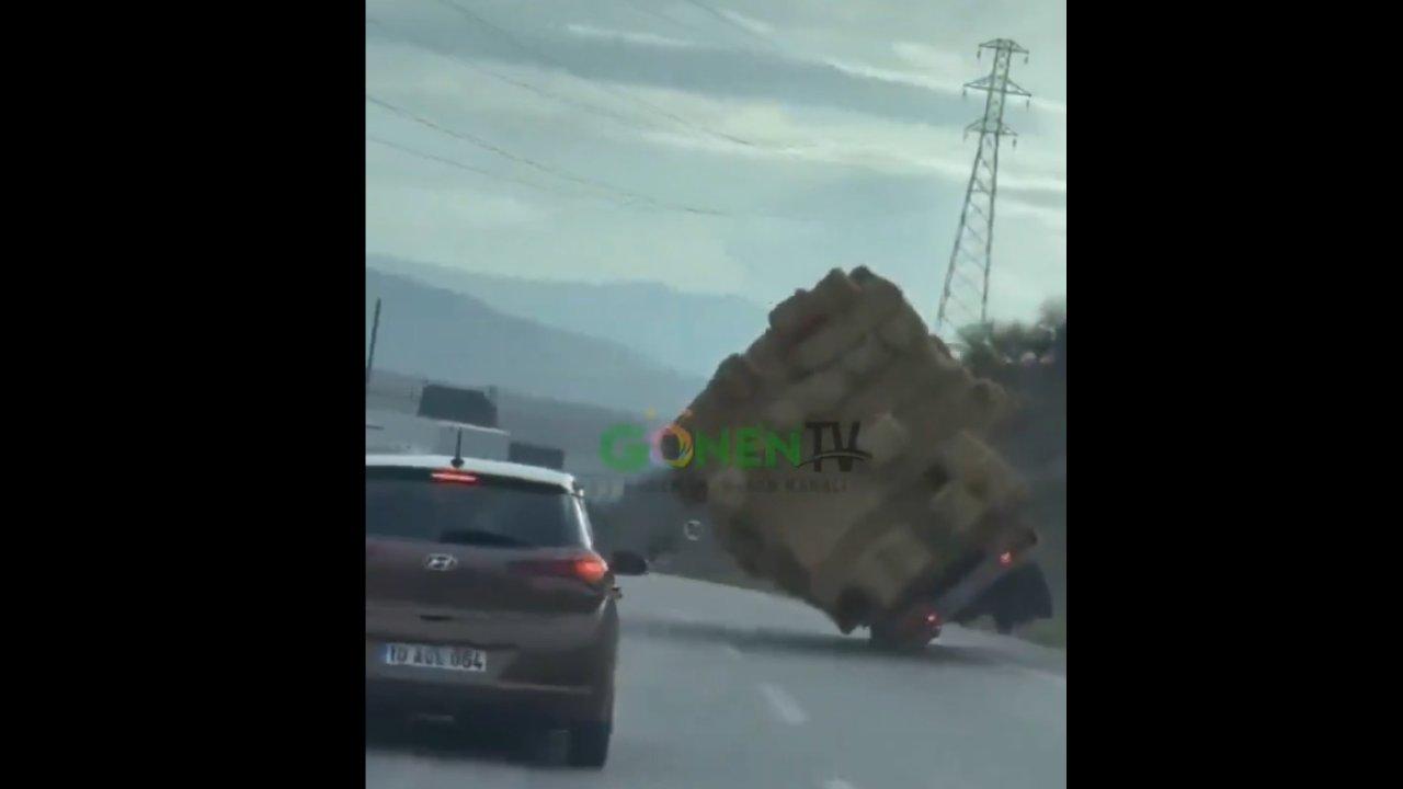 Yükün sol tarafta toplanması sonucunda kamyon şoförünün direksiyon hakimiyetini kaybetmesi nedeniyle meydana gelen kazanın görüntüleri kamyonun arkasında seyir halinde olan bir aracın içinden anbean görüntülendi.