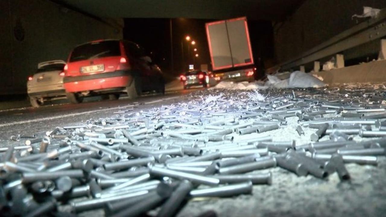 Sultangazi'de aynı anda yolun bir tarafına seyir halindeki TIR'dan perçin torbaları dökülürken, diğer tarafına kamyondan hafriyat döküldü. Her iki olay nedeniyle trafik yoğunlaştı. DHA