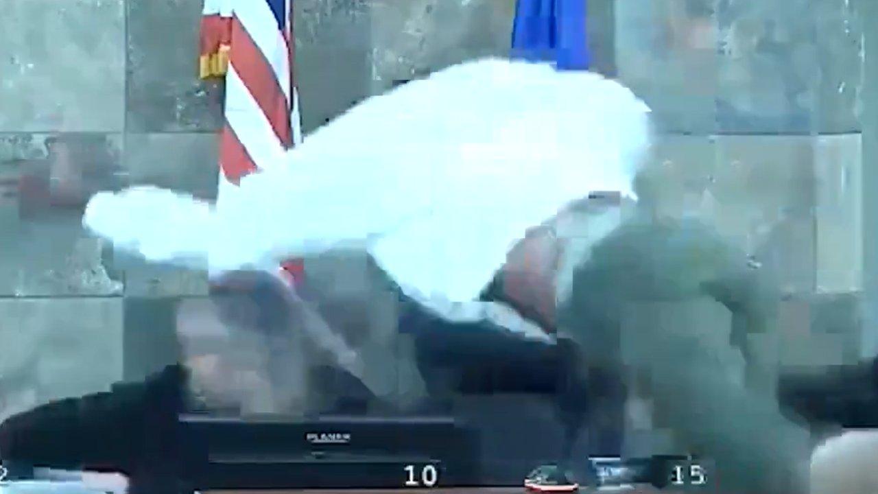 Saldırı esnasında kafasını kürsüye çarpan hakimin hafif yaralandığı açıklanırken, o anların görüntüleri izleyenleri dehşete düşürdü…