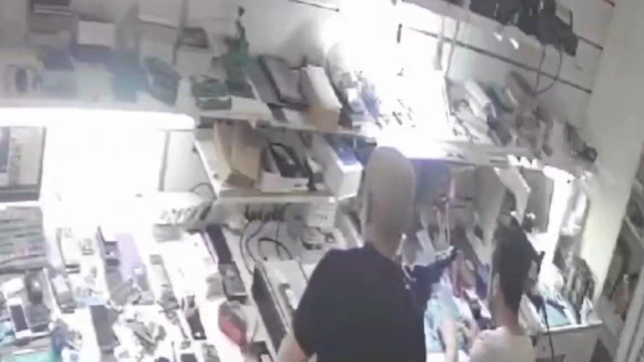 Bir telefon tamircisinde, cep telefonunun tamiratı sonunda patlama meydana geldi. Telefondan dumanlar bir anda yükselince tamirci de elinden hızla tezgaha atarak uzaklaştı.
