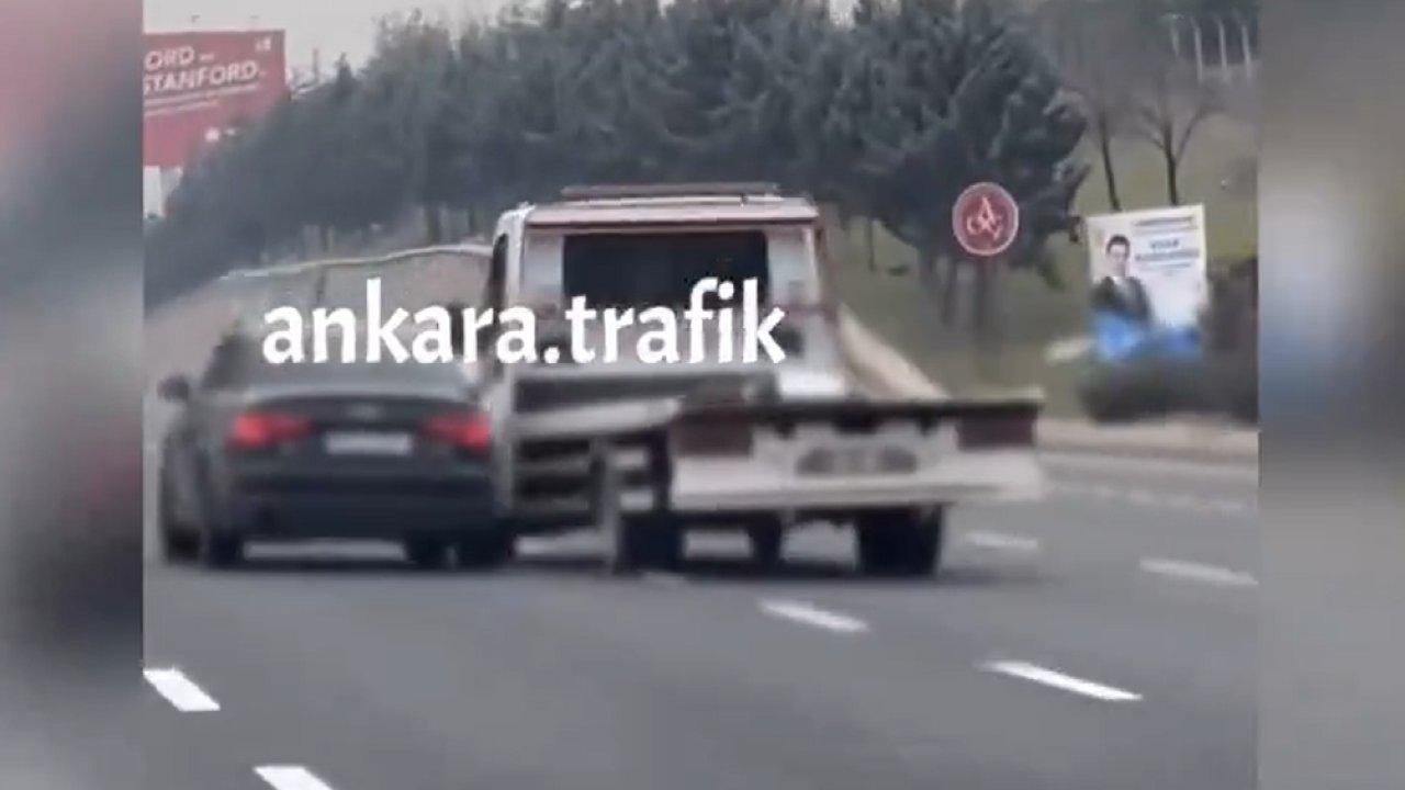 Akıcı trafiğe aldırış etmeyen çekici ve araç yol boyunca birbirlerinin üzerlerine kırıp sıkıştırdı.