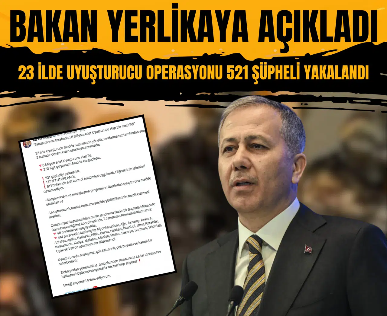 İçişleri Bakanı Ali Yerlikaya, son iki haftadır devam eden kapsamlı operasyonlarda 6 milyon adet uyuşturucu hap ve 270 kilogram uyuşturucu madde ele geçirildiğini duyurdu.