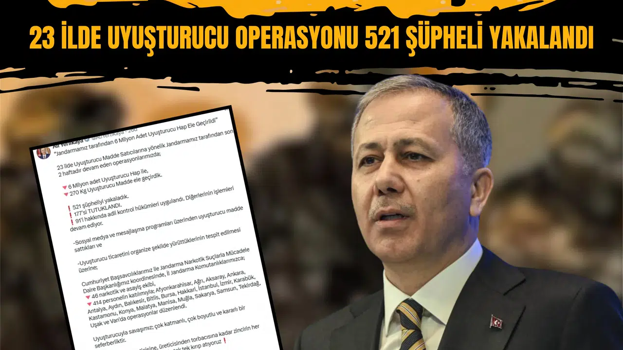 Sosyal medya hesabından açıklama yapan Bakan Yerlikaya, 23 ilde gerçekleştirilen operasyonlarda 521 şüphelinin yakalandığını, bunlardan 177’sinin tutuklandığını, 91 şüpheli hakkında adli kontrol kararı verildiğini, diğer şüphelilerle ilgili işlemlerin ise sürdüğünü belirtti.