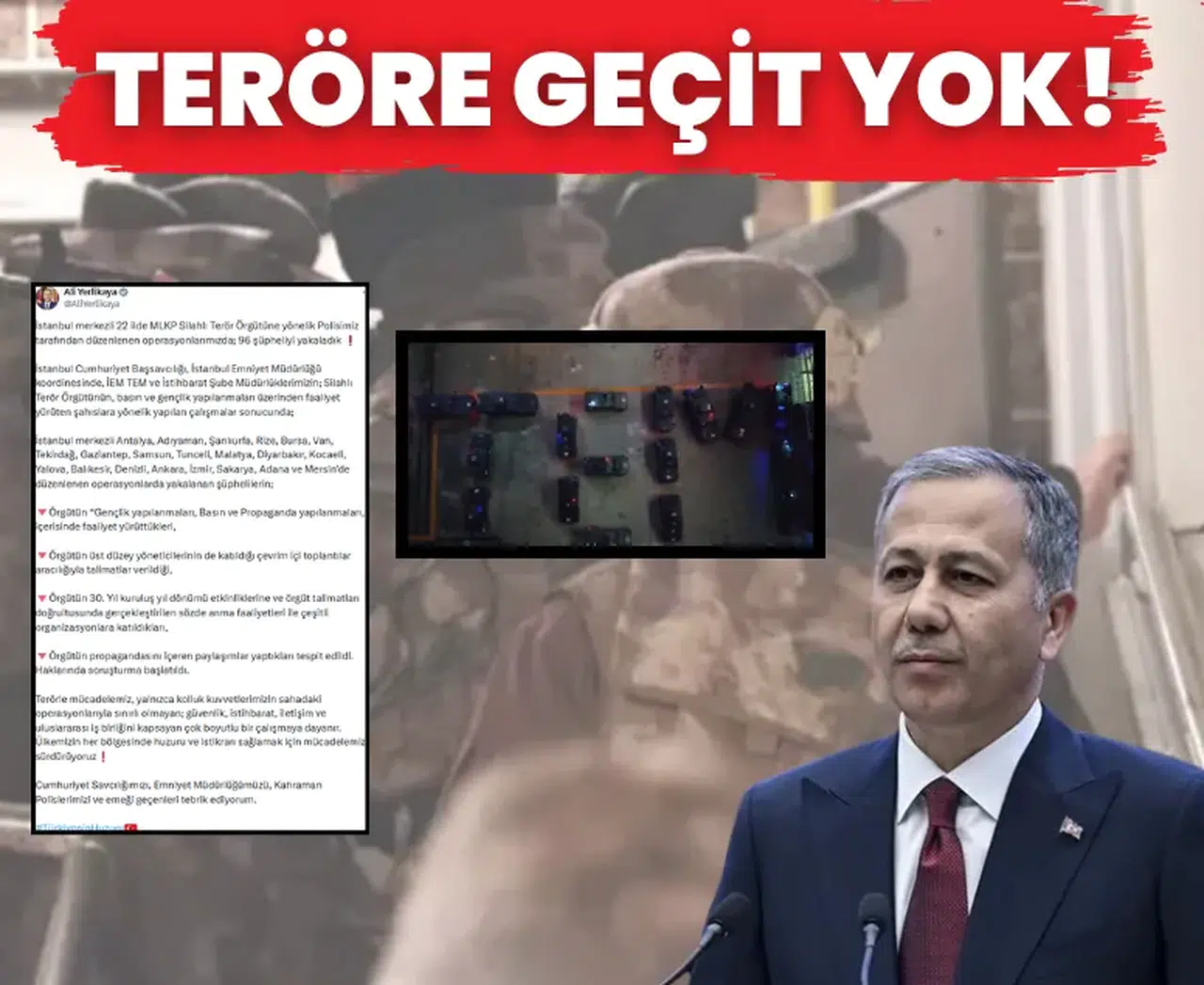Sosyal medya hesabından açıklama yapan Yerlikaya, Türkiye’nin her köşesinde huzur ve güvenliği sağlamak için mücadelenin aralıksız sürdüğünü vurguladı. Yerlikaya, “İstanbul merkezli 22 ilde MLKP silahlı terör örgütüne yönelik polisimiz tarafından düzenlenen operasyonlarımızda 96 şüpheliyi yakaladık” ifadelerini kullandı.