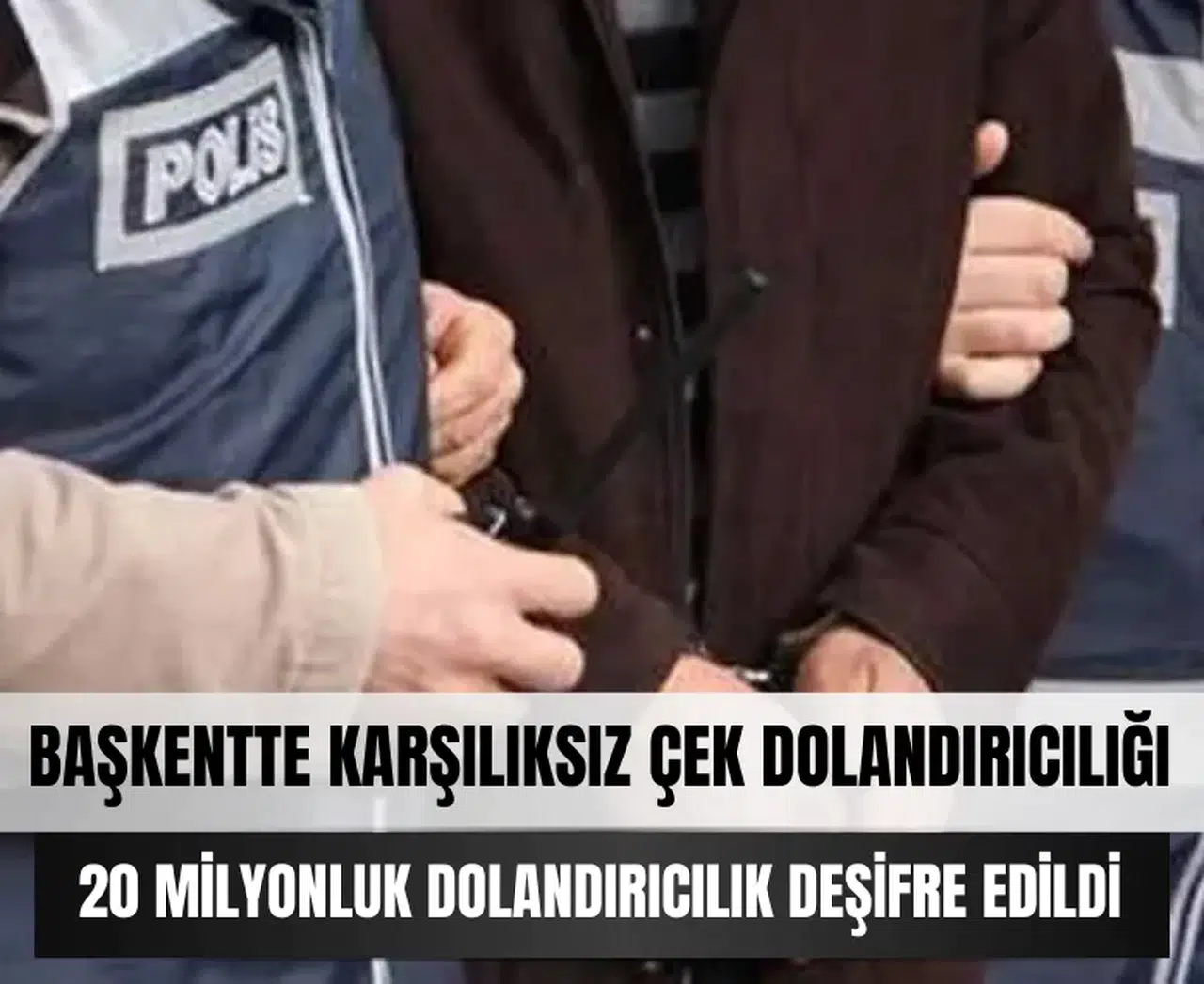 Ankara Cumhuriyet Başsavcılığı’nın talimatları doğrultusunda harekete geçen Ankara Emniyet Müdürlüğü Asayiş Şube ekipleri, piyasaya karşılıksız çek sürerek vatandaşları milyonlarca lira zarara uğratan organize bir yapıyı deşifre etti.